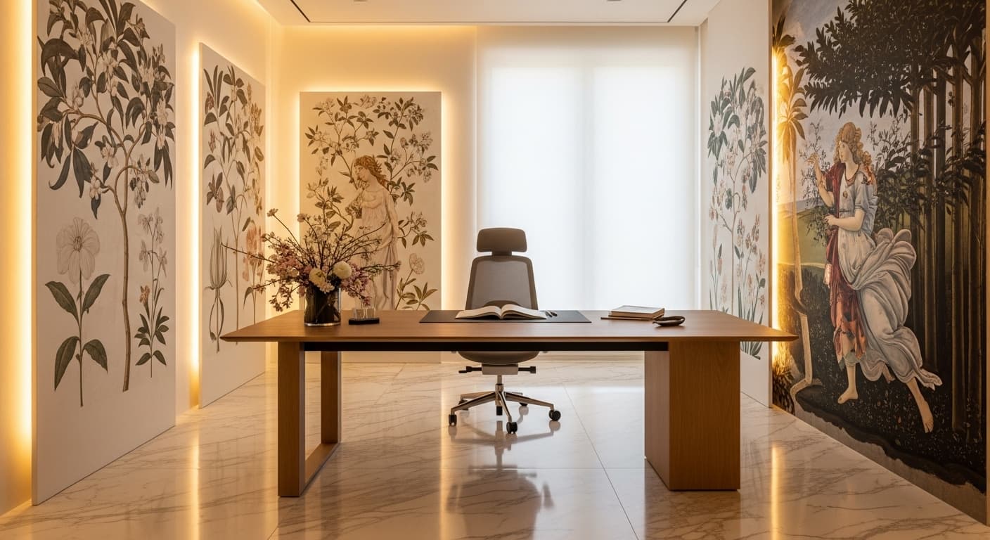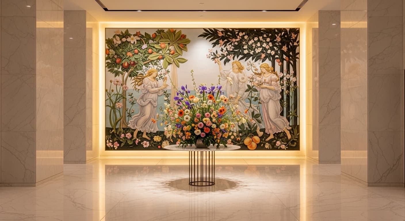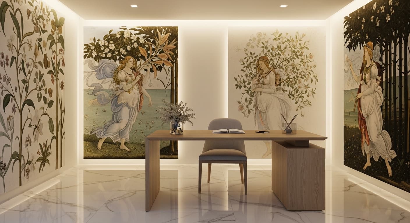 Primavera is a horizontally staged mythological tableau where figures, vegetation, and atmosphere form a continuous processional field. This spatial logic becomes the foundation of the Primavera Signature Engine.
